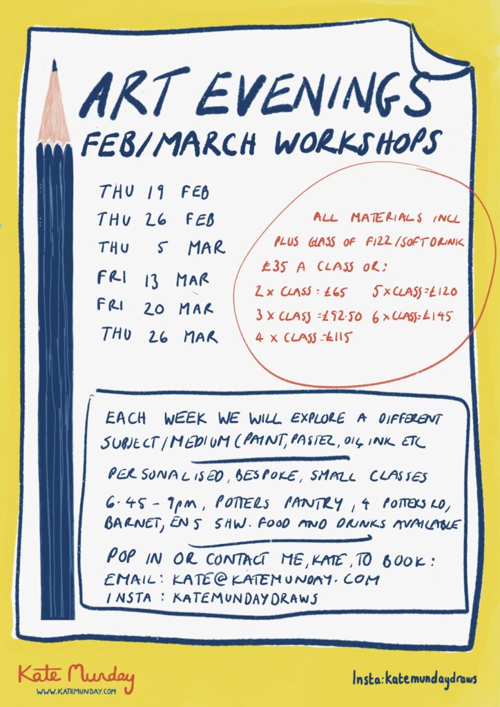 Timings are 6.45pm-9pm and are priced at £35 each which inc. a glass of fizz or soft drink. All materials are also covered. Discounts are available for booking more than one workshop.
